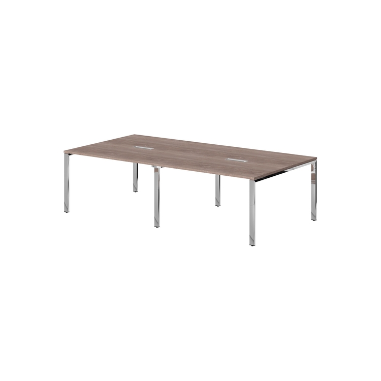 Столешница из ЛДСП т. 25 мм с металлическими прямоугольными заглушками (кабель-каналами) в центре каждой столешницы. Опоры металлокаркаса П-образной формы из полированной нержавеющей стали, труба 60х30х1,5 мм с регулировкой внизу.